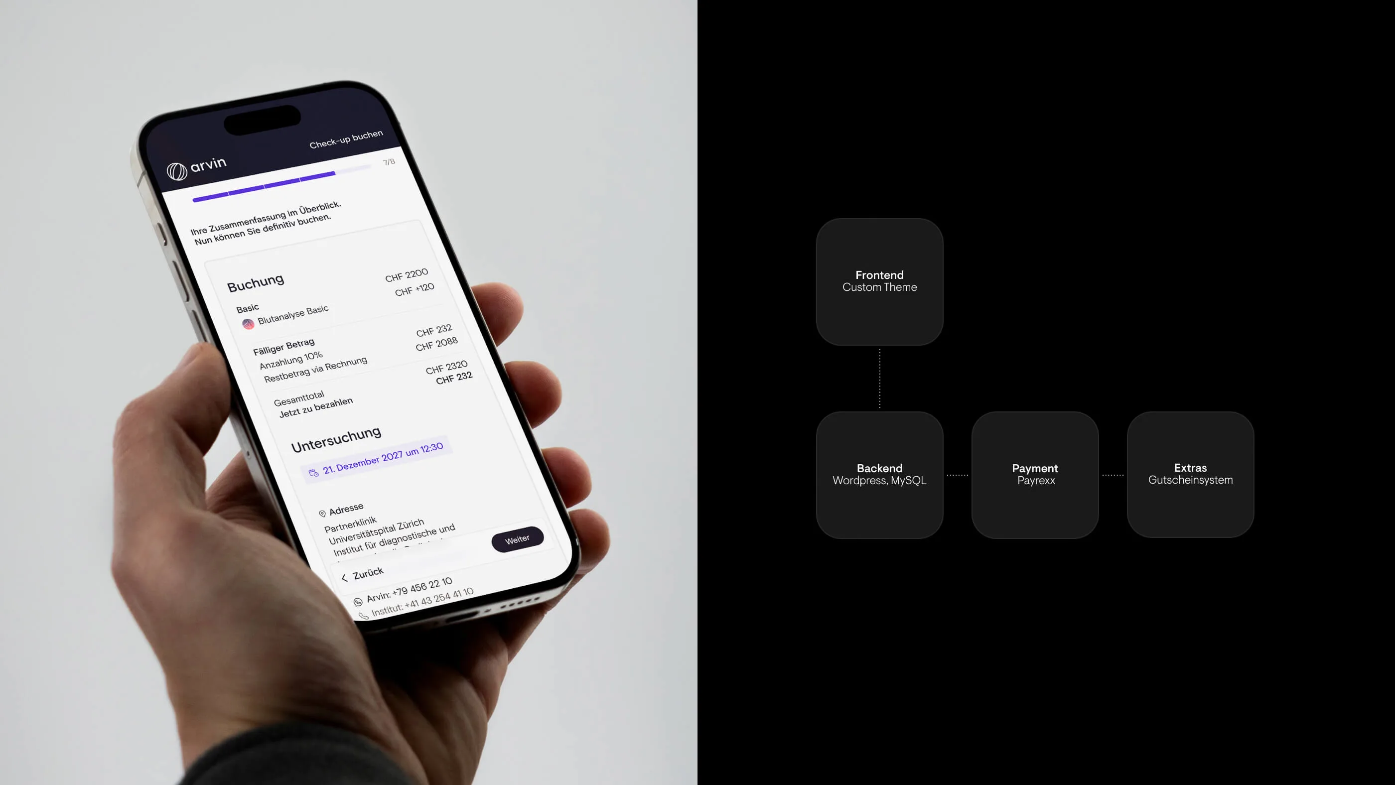 Der Buchungsprozess ist für Arvin ein zentraler Wachstumstreiber. Wir entwickelten ein Interface, das Nutzer intuitiv führt und Vertrauen schafft, während im Hintergrund eine schlanke technische Architektur für reibungslose Abläufe sorgt. Die Integration eines Zahlungsanbieters und eines eigenen Gutscheinsystems vereinfacht den Kaufprozess und stärkt die Kundenbindung.