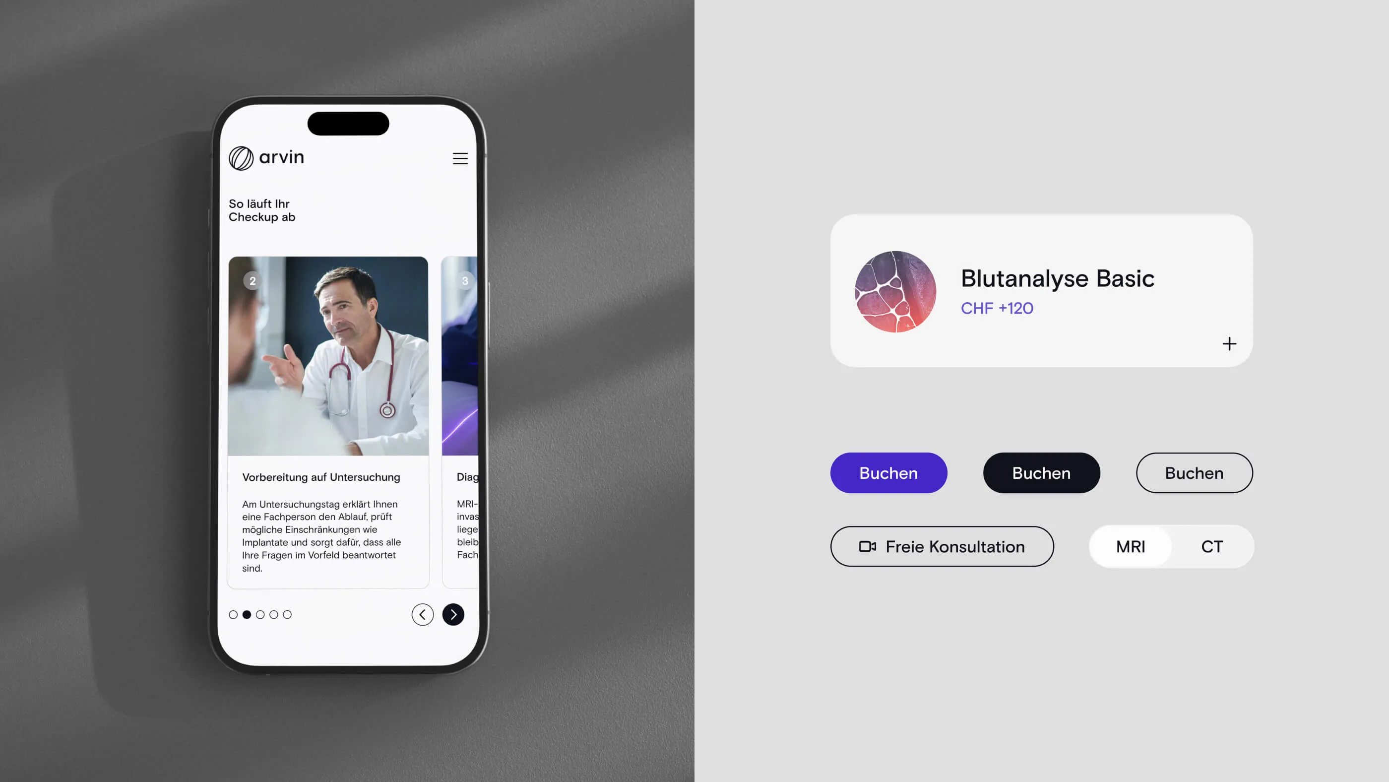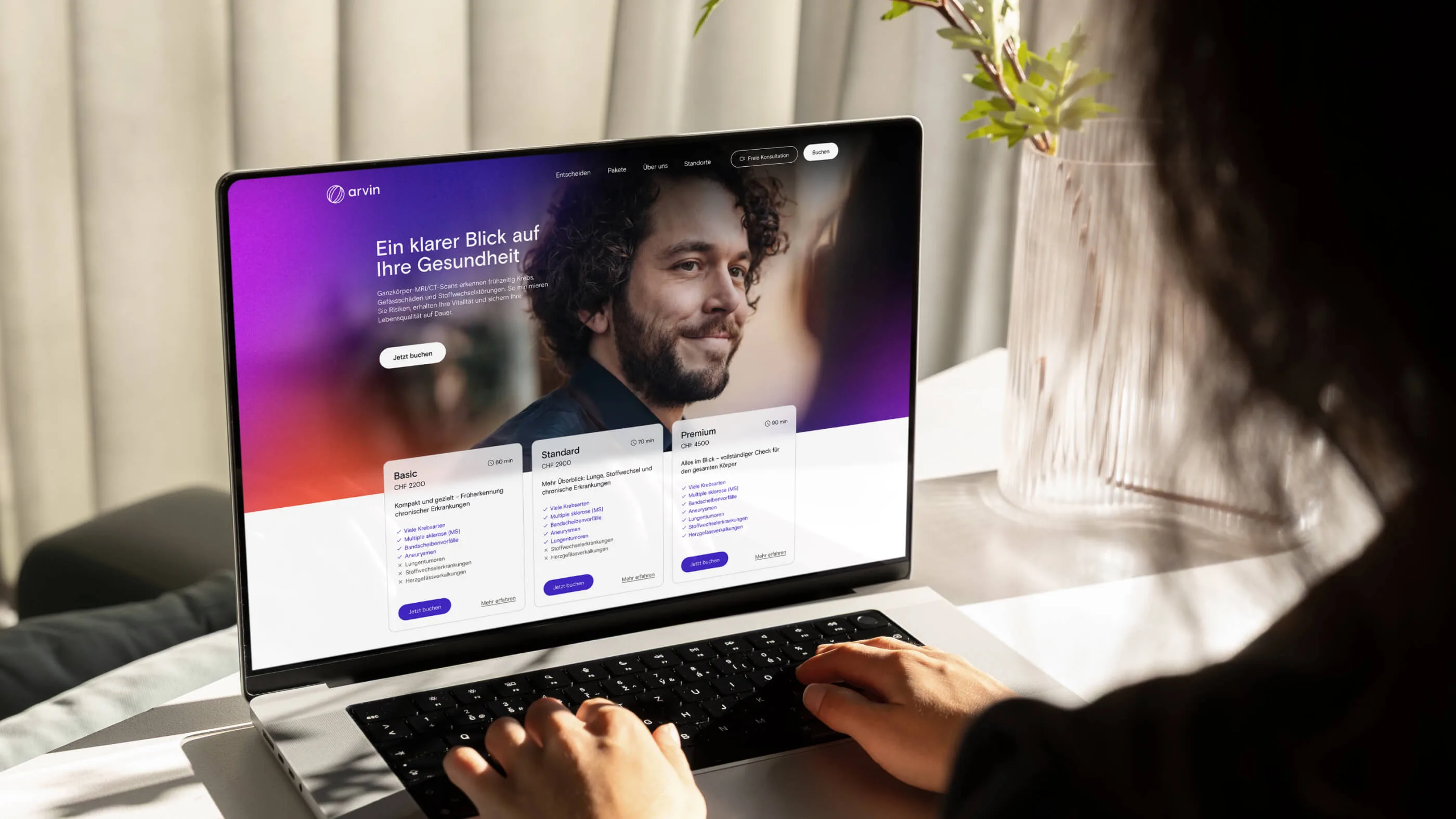 Das Healthtech-Startup Arvin hilft mit präzisen Ganzkörperscans, Gesundheitsrisiken frühzeitig zu erkennen und ermöglicht so einen klaren Blick auf die eigene Gesundheit. Studio Wanner hat das Startup auf dem Weg zu einem professionellen Auftritt begleitet, indem wir die Markenidentität und digitale Webplattform von Grund auf neu gedacht haben. Entstanden ist ein ganzheitliches Nutzererlebnis, das transparent über Services informiert, mit klarer Haltung kommuniziert und durch zeitgenössisches Design überzeugt. So entsteht Vertrauen in die Marke und Klarheit, die neue Kund:innen überzeugt.