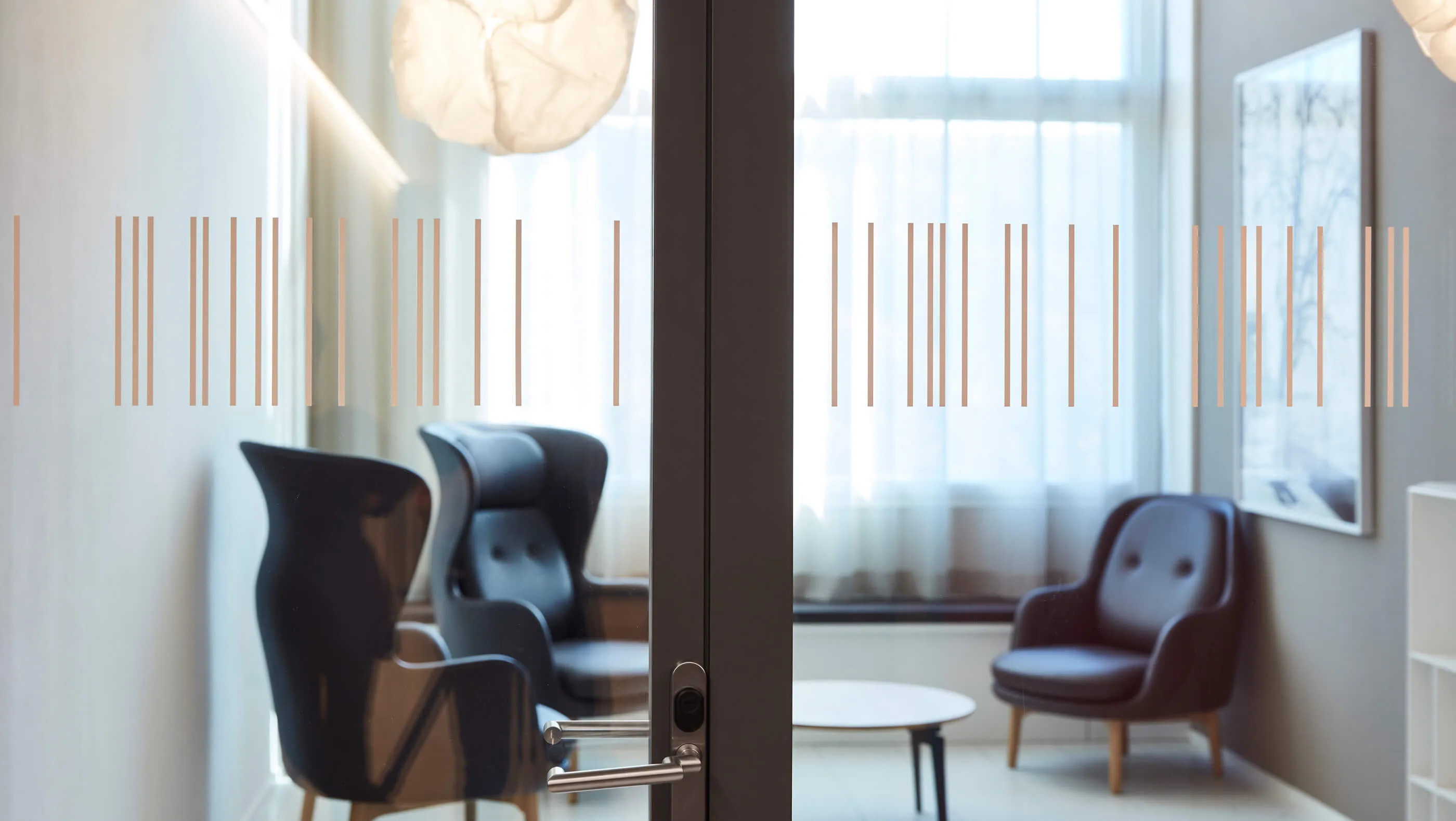 Der Auflaufschutz ist eine gesetzliche Norm für Innenverglasungen in öffentlichen Gebäuden. Das Linienraster nimmt Bezug auf und verstärkt die vertikale Ausrichtung der hohen Gemeinschaftsräume.
